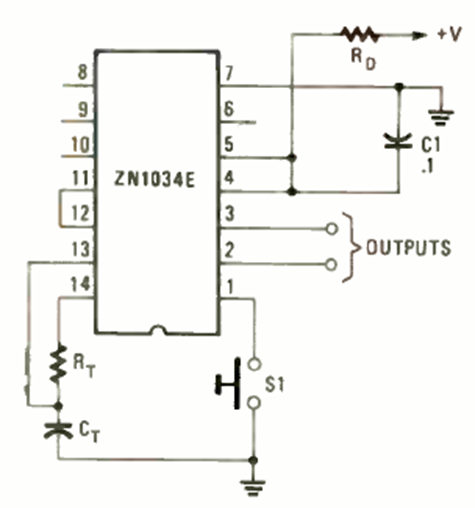 Este temporizador, utilizando el ZN1034E 'de una revista de Radio Electronics de mayo de 1987. El circuito puede proporcionar intervalos de hasta 19 días, desde un RC con una constante de tiempo de 220 segundos.