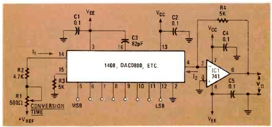 El voltaje de referencia de este circuito se puede seleccionar digitalmente. El circuito es de Radio Electronics de febrero de 1981. El 741 debe ser alimentado por una fuente simétrica.
