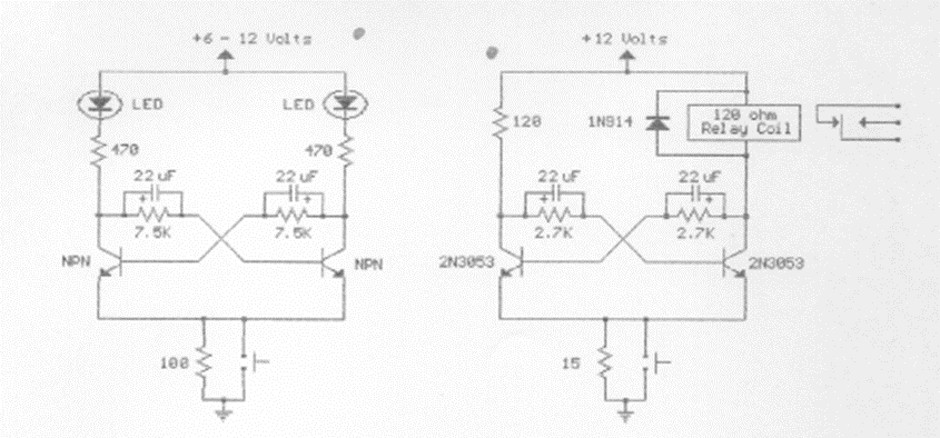 Este circuito se encontró en documentación de los años 90. Los transistores pueden ser equivalentes de uso general. El circuito tiene dos versiones, una que activa LEDs y otra que activa un relé como carga.