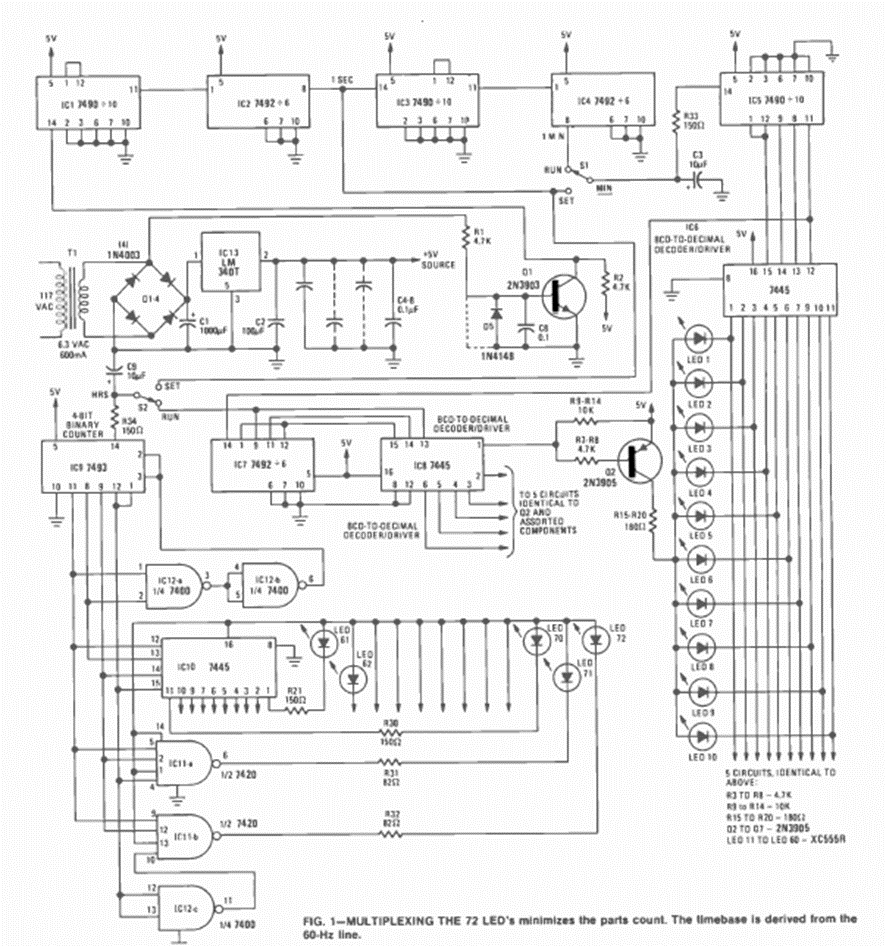 Este interesante circuito en el que la pantalla LED es circular imitando un reloj común apareció en la revista Radio Electronics en mayo de 1977. La fuente de alimentación está incluida.