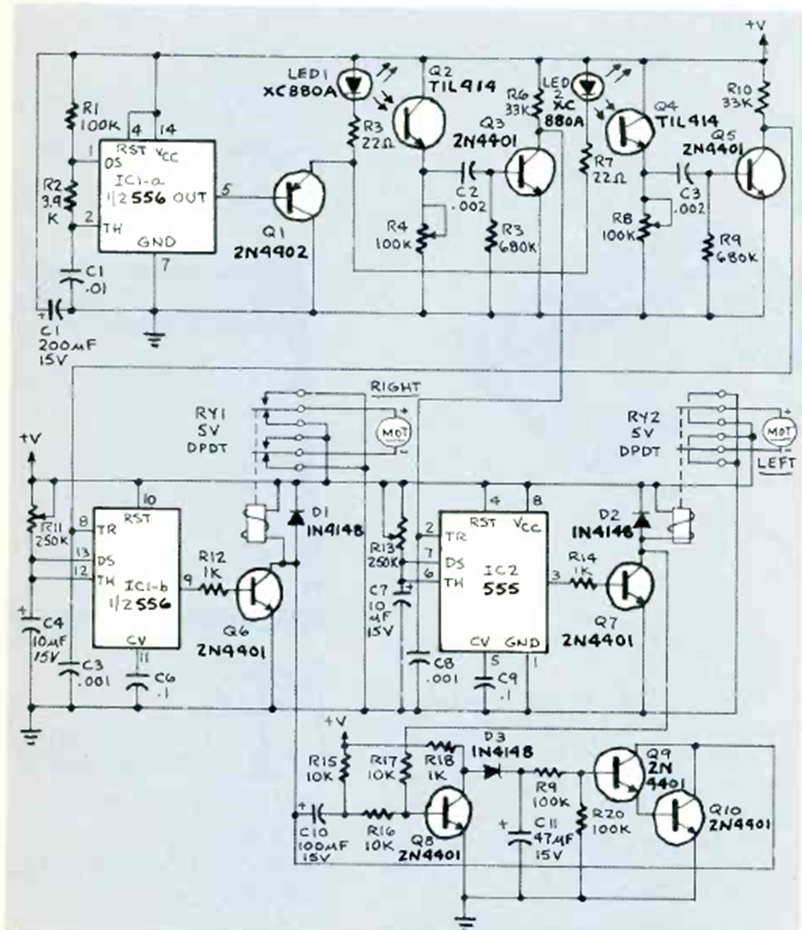Este circuito de sensor óptico para robot se encontró en la revista Radio Electronics de marzo de 1986. Controla dos motores según señales de sensores ópticos o acopladores.