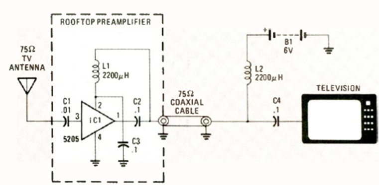 Este circuito que también sirve para amplificar señales de FM desde una antena externa fue encontrado en la revista Radio Electronics de mayo de 1987. Tenga en cuenta que el circuito se alimenta del propio cable de acometida.