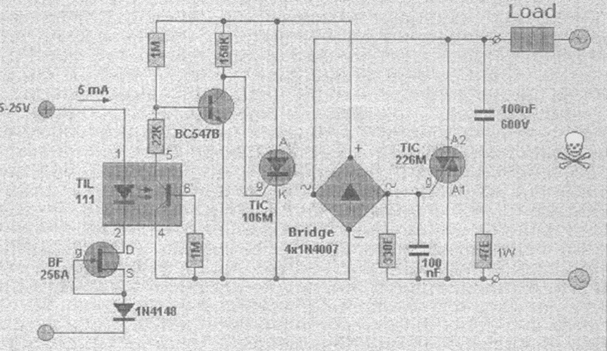 Encontramos este circuito en una publicación de los años 80. El circuito controla un triac con aislamiento proporcionado por el uso de un acoplador óptico. El LED acoplador tiene un control de corriente para que en el rango de tensión indicado la corriente sea siempre de 5 mA.
