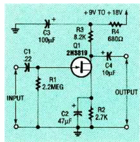 Se puede utilizar cualquier JFET en este circuito sugerido por la revista Electronics Now, abril de 1993. El circuito tiene alta impedancia de salida.