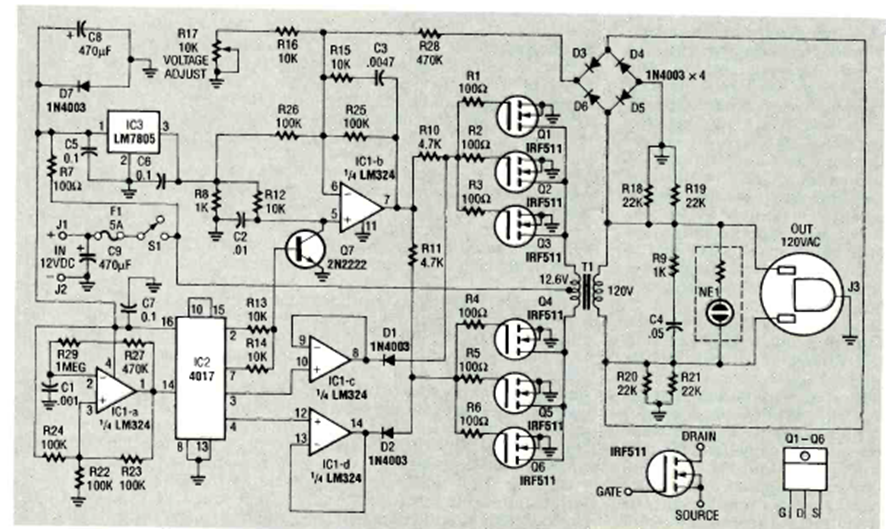 Este potente inversor proporciona una señal sinusoidal de alta calidad. Lo encontré en una Radio Electrónica de Abril de 1991. La potencia de salida es de 40 W.