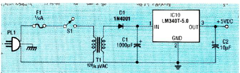 Esta fuente de alimentación de 5 V se encontró en la edición de enero de 1992 de la revista Radio Electronics. El circuito integrado debe estar equipado con un disipador de calor y la corriente es de 1 A.