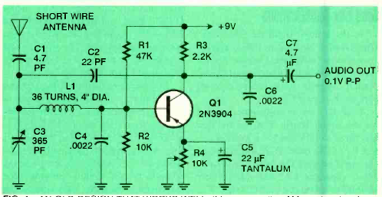 Este circuito simple tiene buena ganancia y se puede implementar con cualquier transistor de propósito general. El circuito es de Eleectronics Now, junio de 1997. La bobina determina el rango de frecuencia.