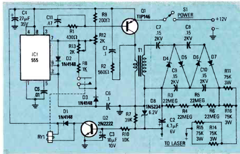 Esta fuente láser HeNe se encontró en la edición de marzo de 1989 de la revista Radio Electronics. Esta fuente generaba unos pocos miles de volts para la ignición del gas.