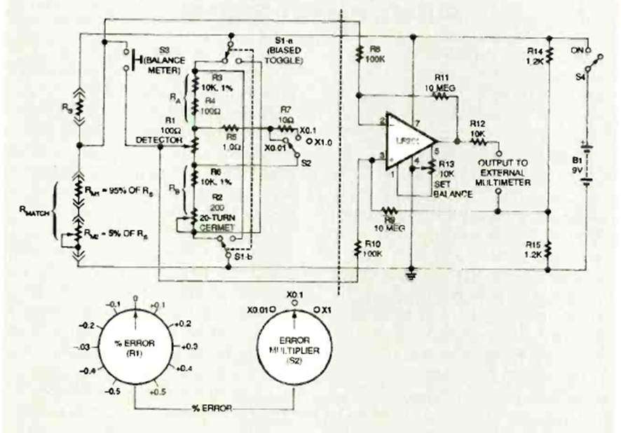 Encontramos este circuito en la revista Electronics Now de noviembre de 1995. El circuito es más preciso que el anterior utilizando un multímetro externo como indicador.