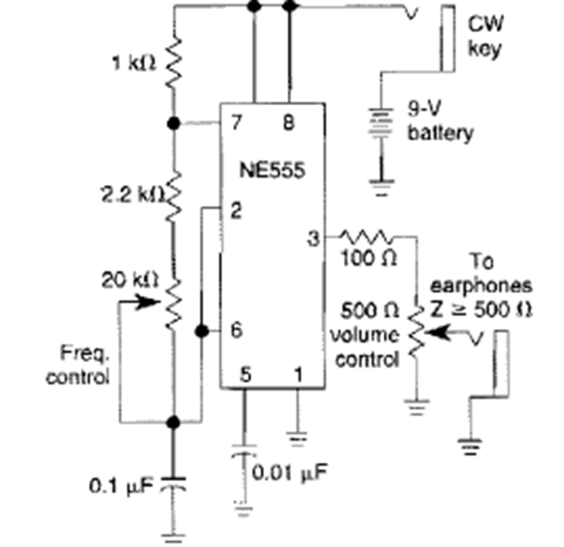 Este circuito, ubicado en un William Sheets, puede usarse con auriculares o un amplificador externo. El tono se ajusta con el potenciómetro.