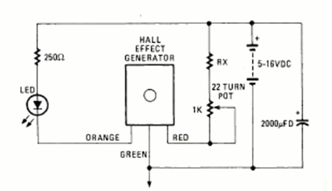 Este detector muy simple utiliza un sensor Hall con un péndulo con un imán, lo que hace que se encienda un LED en caso de vibraciones. El circuito es de un Electronics Experimenter Handbook – Special projects de 1983.