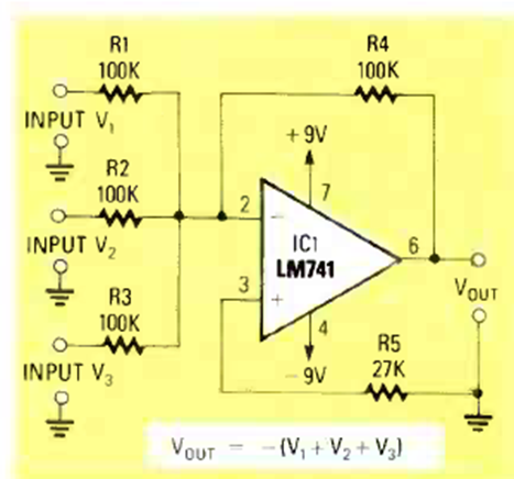 Este circuito se encontró en la edición de mayo de 1989 de la revista Radio Electronics. El circuito requiere una fuente de alimentación simétrica. Se pueden añadir más entradas.