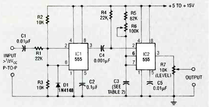 Encontramos este circuito en la revista Radio Electronics de septiembre de 1992. Puede activarse con cualquier señal superior a ½ Vcc, donde Vcc es la tensión de alimentación.