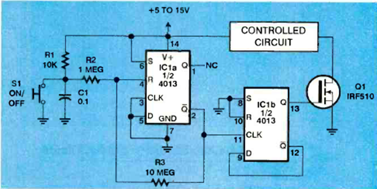 Encontrado en la revista Electronics Now de abril de 1998, este circuito controla cargas que dependen del transistor de potencia. El circuito utiliza un solo interruptor de presión para el control.