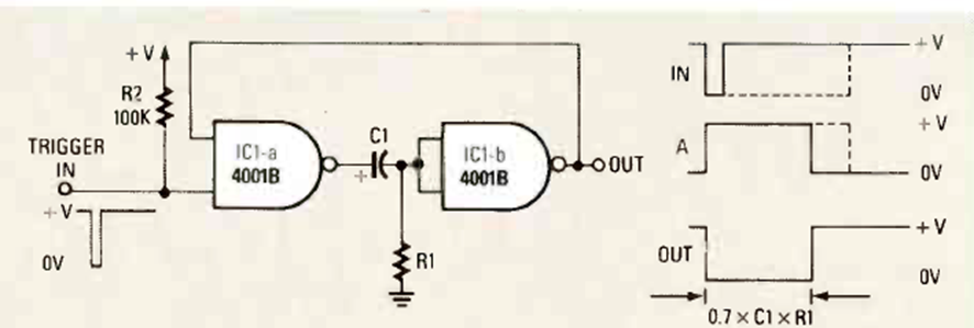Este monoestable de dos puertos 4001 fue sugerido en un artículo de la revista Radio Electronics de abril de 1988. Los tiempos están dados por C1 y R1.