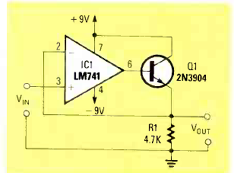 En la figura tenemos la forma de aumentar la corriente de salida a unos 50 mA de un amplificador operacional. El circuito requiere una fuente de alimentación simétrica.