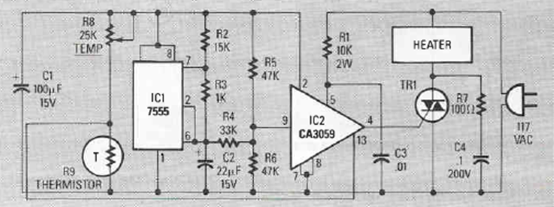 El circuito integrado disparador triac no es muy común hoy en día. El circuito fue encontrado en la revista Radio Electronics Experimenter de 1989. El triac debe estar de acuerdo con el calentador.