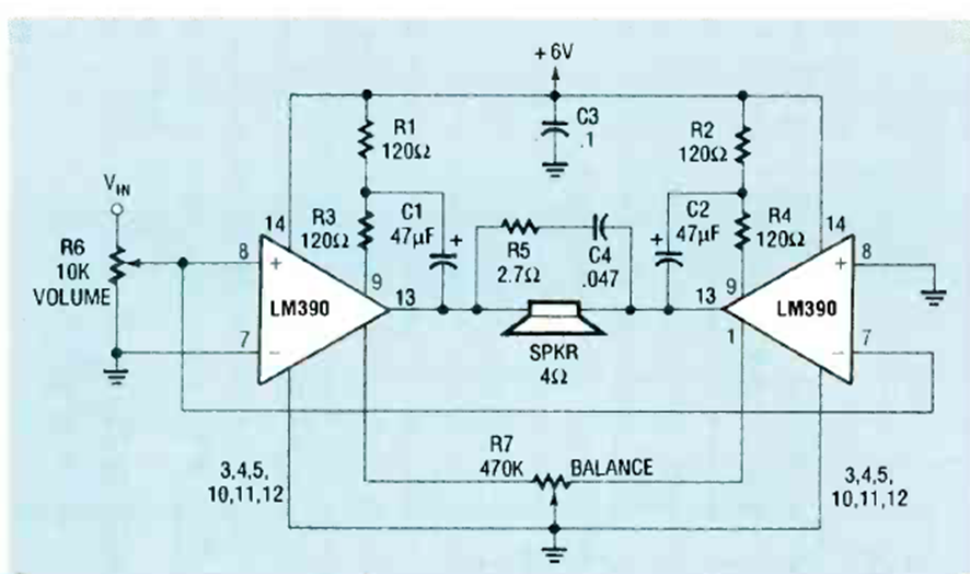 Este circuito proporciona una potencia de 2,5 W con una fuente de alimentación de 6 V y un altavoz de 4 ohms. Lo encontramos en la revista Radio Electronics de abril de 1990.
