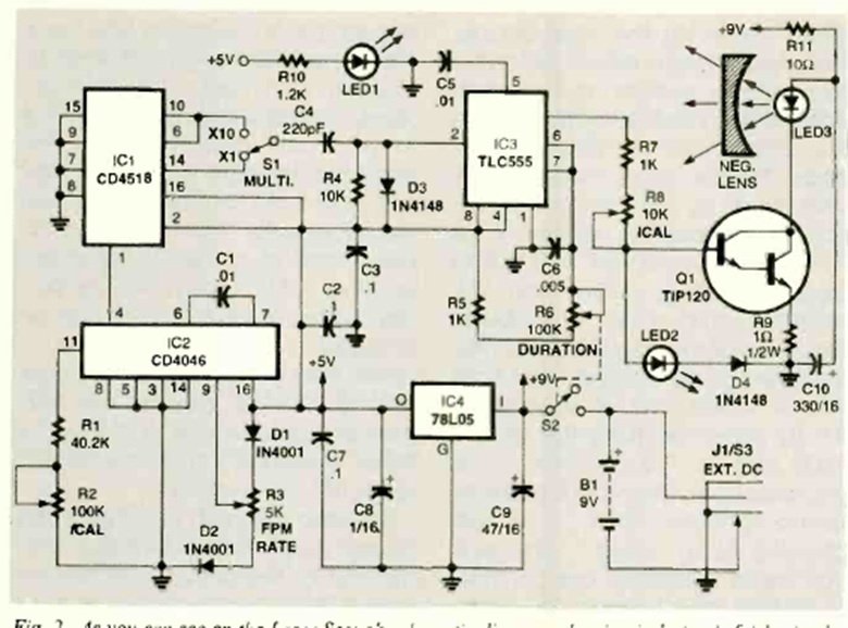 Con este nombre la revista Electronics Now en su último número de noviembre de 1999 publicó este proyector láser para “congelar” instantes y así determinar su velocidad. El circuito utiliza un diodo LASER.