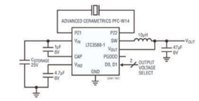 El circuito de la figura es sugerido por Linear Technologies (www.linear.com) y consiste en un sistema que convierte la energía generada por un transductor piezoeléctrico en un voltaje directo ajustable externamente. Este circuito se puede utilizar para convertir la vibración de una máquina en un voltaje de suministro para un sensor o circuito de control. Una aplicación interesante es la de alimentar circuitos de sensores de presión en neumáticos de vehículos, donde la propia vibración se convierte en energía para alimentar el circuito inalámbrico. Los voltajes de salida se pueden seleccionar entre 1,8 V y 3,6 V. Puede encontrar más información en el sitio web de la empresa, donde la hoja de datos está disponible para descargar.