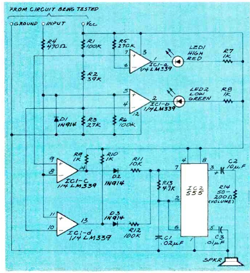 Este circuito tiene indicación de estado visual y audible mediante un oscilador. El circuito es de una revista Radio Electronics de junio de 1991.