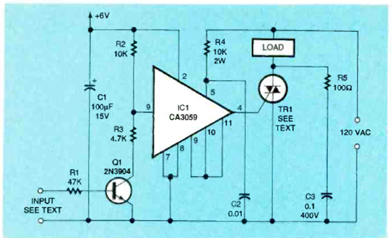 Este circuito con el CA3059 fue encontrado en la revista Electronicas Now de julio de 1995. La señal debe ser DC y el circuito no está aislado de la red eléctrica.
