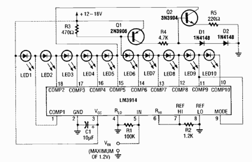 Este circuito consiste en una versión mejorada de los anteriores con el LM3914. Lo encontramos en la revista Radio Electronics de marzo de 1992.
