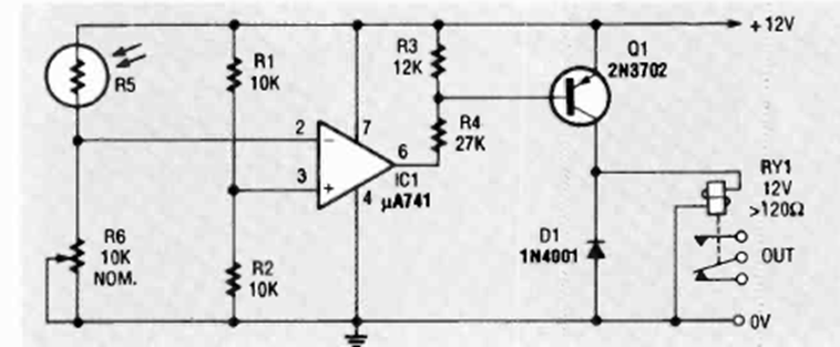 Este circuito para relés de 12 V se encontró en la edición de julio de 1992 de la revista Radio Electronics. El circuito está ajustado en R6.