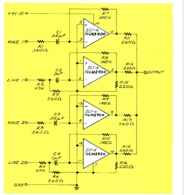 Encontramos este circuito en la edición de octubre de 1993 de la revista Electronics Now. El circuito de 4 canales se alimenta con una fuente de alimentación simple de 9-12 V.