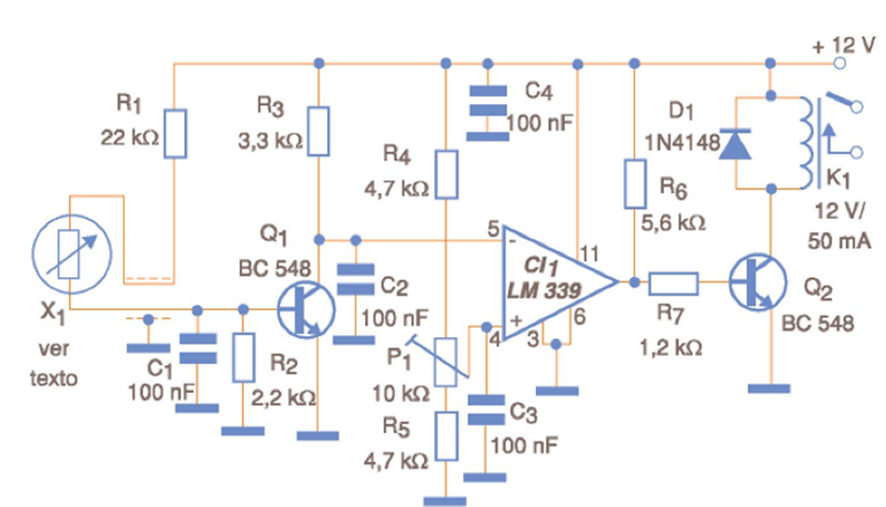 El termostato de uso general que se muestra en la figura utiliza un termistor de alta resistencia como sensor. Se pueden utilizar termistores en el rango de 47 k ohmios a 220 k ohms y en su función se debe cambiar el valor de R3 para obtener la sensibilidad deseada y el punto de disparo del relé. Mediante una etapa amplificadora transistorizada, se detectan pequeñas variaciones en la resistencia del termistor, llevando el circuito al punto de disparo. El ajuste de este punto de disparo se da mediante el trimpot conectado a la entrada de referencia del comparador. Para una mayor precisión se debe utilizar un potenciómetro multivuelta. El relé utilizado es del tipo sensible con bobina de 50 mA (máximo) y tensión acorde a la de la fuente de alimentación. Si el sensor se encuentra algo alejado del circuito (más de 2 metros) se deberá utilizar un cable blindado con la malla debidamente conectada a tierra. El capacitor de 100 nF en la entrada del termistor evita que transitorios o pulsos de corta duración provoquen que el circuito se dispare de manera errática. La fuente de alimentación debe estar estabilizada para no afectar el punto de activación del circuito. Una posibilidad que se puede analizar para algunas aplicaciones es la colocación de un diodo común con polarización inversa como sensor de temperatura.
