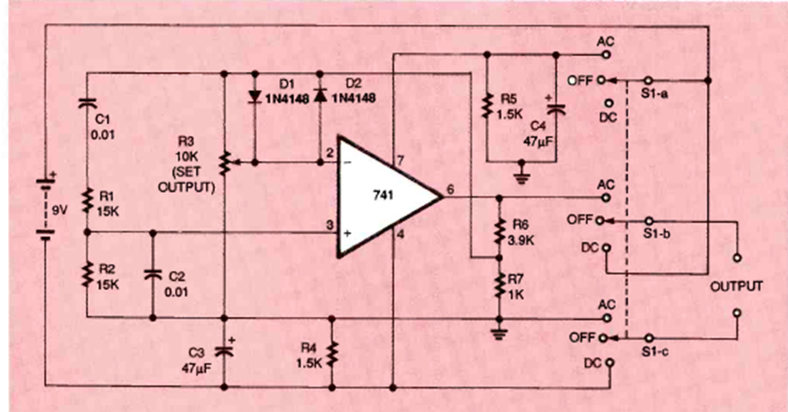Este circuito proporciona tensiones y una señal de 1 kHz para se medir con puentes. El circuito es de una revista Electronics Now de septiembre de 1995.