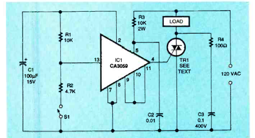 Este circuito es una versión alternativa del anterior que también se encuentra en la revista Electronics Now de julio de 1995. El triac debe estar equipado con un disipador de calor.