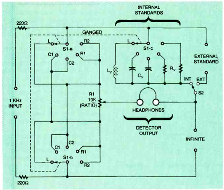 Este puente para inductancias, capacitancias y resistencias fue encontrado en la edición de septiembre de 1995 de la revista Electronics Now. Los auriculares deben ser de alta impedancia, para una mayor sensibilidad y la precisión depende de los componentes utilizados como referencia.