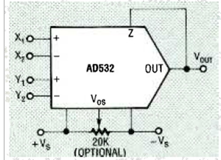 Basado en el AD632, este circuito proporciona una tensión de salida proporcional al producto de las tensiones de entrada.