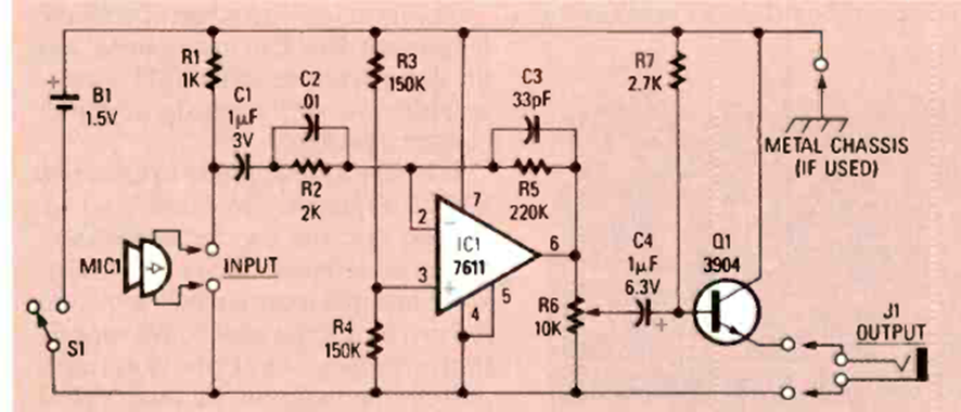 Apto para escucha clandestina y montaje SMD, este circuito fue encontrado en la revista Radio Elecronics de agosto de 1988. La escucha se realiza a través de auriculares y el amplificador electreto.