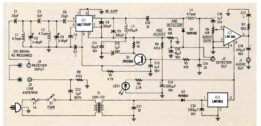Para señales de hasta unos 500 kHz moduladas en amplitud y transmitidas por la red eléctrica, en la figura tenemos el receptor. El circuito es de una Radio Electronics de febrero de 1989.