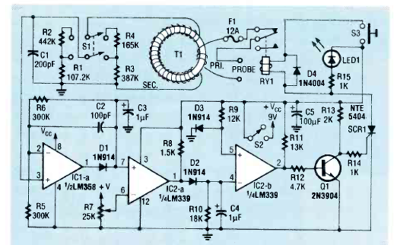 Este circuito se encontró en la edición de diciembre de 1991 de la revista Radio Electronics. El circuito se basa en un transformador de corriente que acciona un SCR.