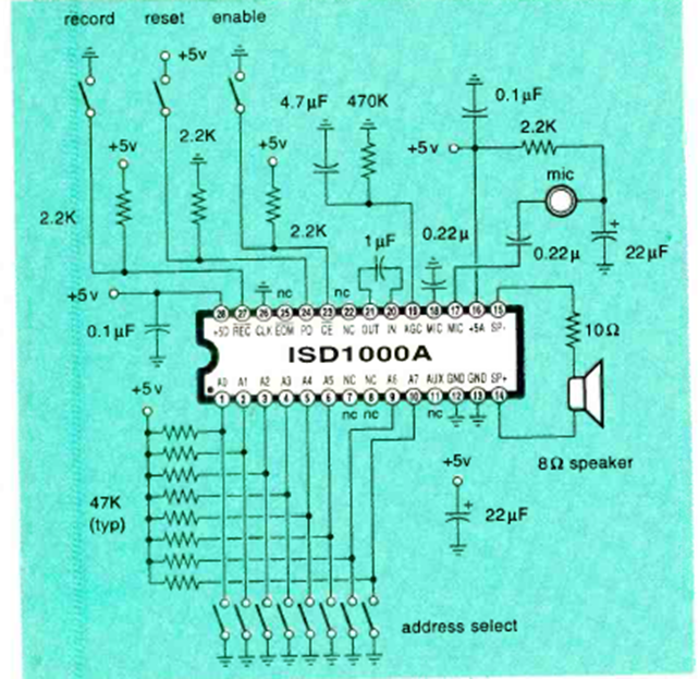 El circuito mostrado se encontró en la edición de febrero de 1994 de la revista Electronics Now. El circuito graba mensajes durante unos segundos y los reproduce al pulsar las teclas.