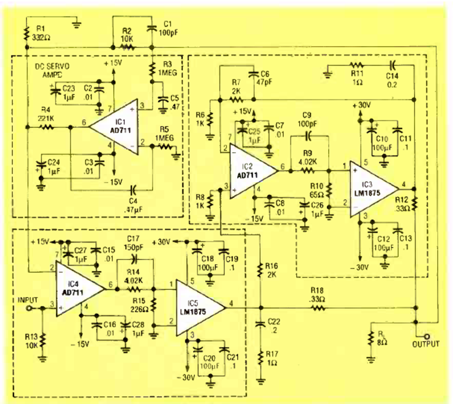 Encontramos este circuito en la edición de noviembre de 1992 de la revista Radio Electronics. La fuente de alimentación de 30 V debe ser simétrica e incluye etapas de preamplificación.