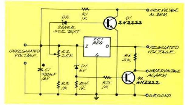 Este circuito de Electronics Now proporciona una señal cuando el voltaje de una fuente cae por debajo de un valor programado. Los componentes de potencia deben estar equipados con disipadores de calor.