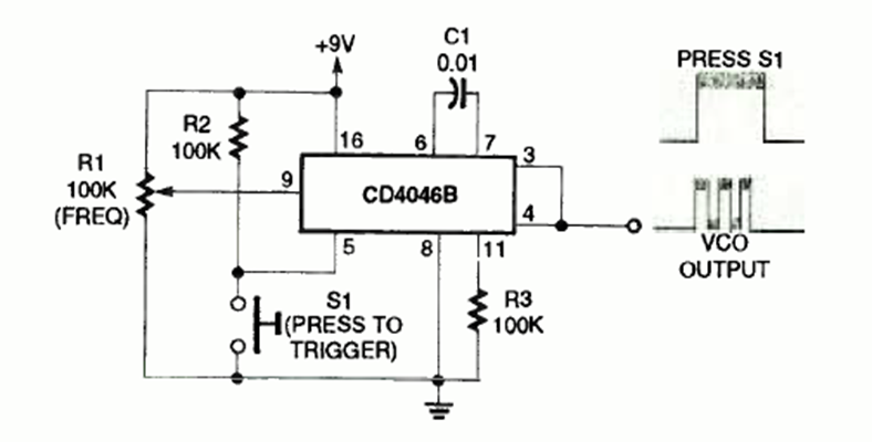 Encontramos este circuito con el CMOS4046 en la revista Electronics Now de agosto de 1994. El circuito se activa presionando el interruptor S1.