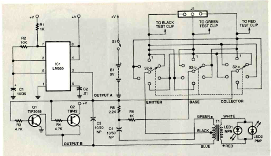Este circuito tiene como objetivo identificar los terminales del transistor a través de un interruptor selector que se activará hasta encontrar la combinación correcta de terminales. El circuito es de Electronics Now de febrero de 1999.