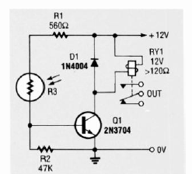 Este circuito LDR simple fue encontrado en la revista Radio Electronics de julio de 1992. Se puede utilizar cualquier transistor comúnmente utilizado. La alimentación de energía depende del relé.