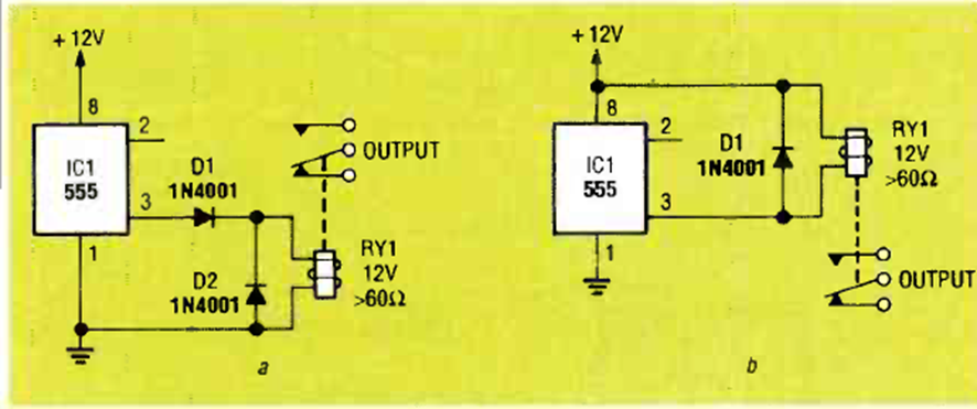 El 555 puede controlar relés de hasta 100 mA con el circuito recomendado. El circuito es de un artículo de la revista Radio Electronics de septiembre de 1992.