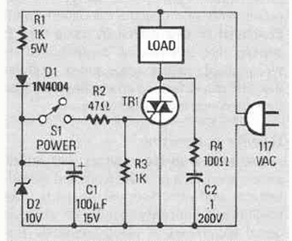 Este circuito fue encontrado en la edición de 1989 de Radio Electronics Experimenter. El circuito tiene el triac según la carga que se quiera controlar.