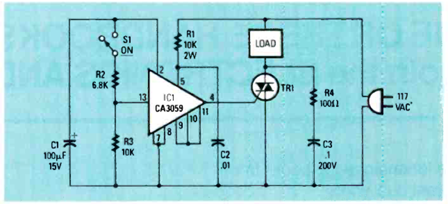 El circuito integrado utilizado en este circuito es del momento de la publicación. El circuito es de una marca Radio Electronics de octubre de 1987. El triac debe estar equipado con un disipador de calor.