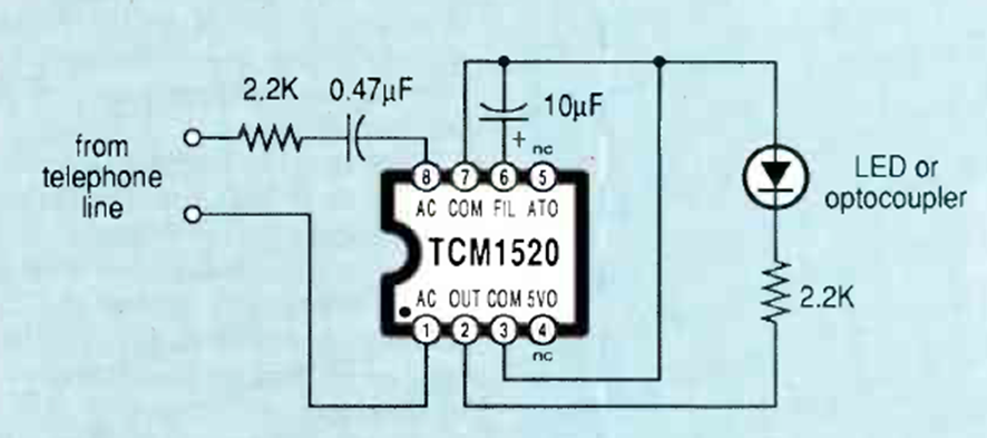 Este circuito es para teléfonos antiguos con líneas analógicas. Fue encontrado en la revista Radio Electronics de mayo de 1988. El circuito está alimentado por la señal de línea.
