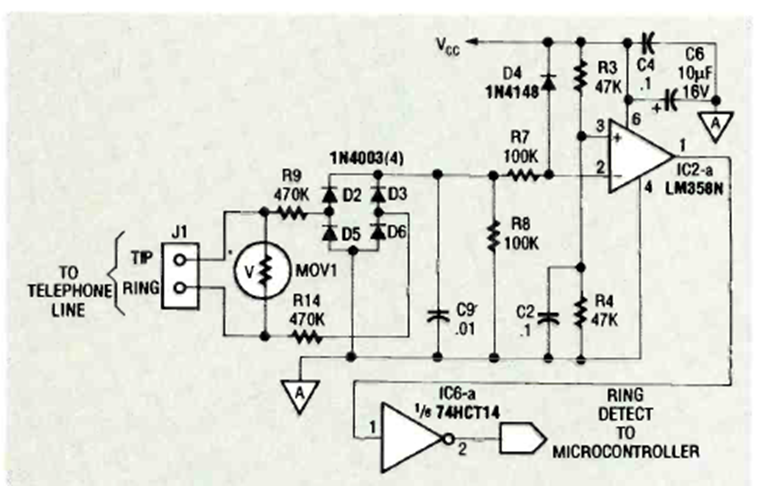Este circuito se encontró originalmente en la revista Radio Electronics y permite la transmisión de señales digitales a través de la línea telefónica. El circuito se aplica a lineas de la época.