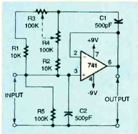 Este filtro de 2,2 Hz a 24 kHz se encontró en la revista Electronics Now de febrero de 1995. El circuito requiere una fuente de alimentación simétrica y admite otros amplificadores operacionales.