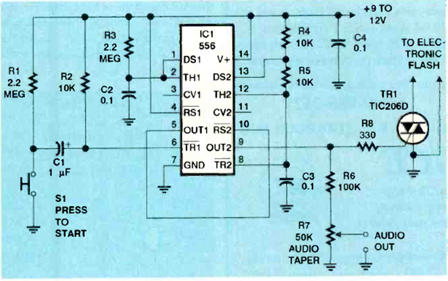 Este circuito fue encontrado en la edición de febrero de 1999 de la revista Electronics Now. El circuito consta de un temporizador que activa un dispositivo de inicio visual y audible.